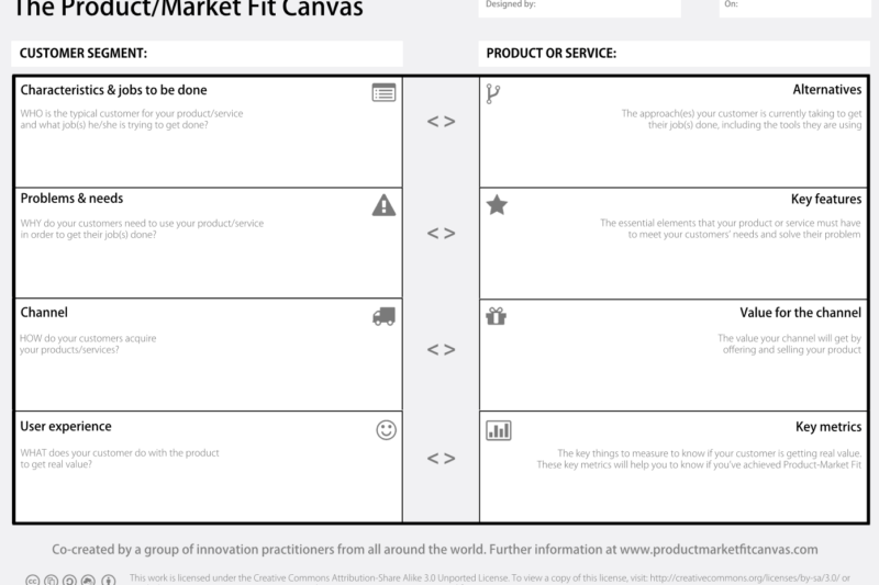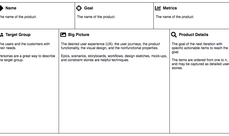 نموذج المنتَج Product Canvas هو النموذج الذي يضم المعلومات والتفاصيل الأساسية واللازمة لإنشاء منتج جديد، مثل المستخدمين، العملاء، احتياجات العملاء، وظيفة المنتج، تصميم المنتج، تفاعل المستخدم مع المستخدم، وغير ذلك.