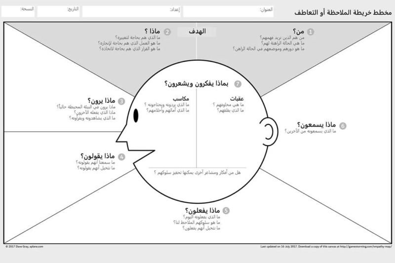 خريطة التعاطف هي إحدى الأدوات التي تساعدك في وضع نفسك مكان العميل الحالي أو المحتمل، حيث تقوم بتحليل تجاربهم وخلفياتهم.